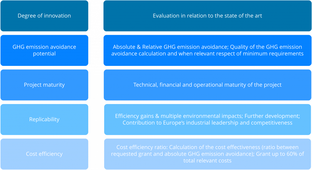 The call is open for projects with capital expenditure between EUR 20 and 100 million located in EU Member States or EEA Countries (i.e. Norway, Iceland or Liechtenstein). Projects will be evaluated against five criteria: degree of innovation, greenhouse gas emission avoidance, project maturity, replicability and cost efficiency. The selected projects will contribute to the transition to a climate-neutral economy by 2050 and, particularly, the decarbonization of sectors covered under the EU ETS.